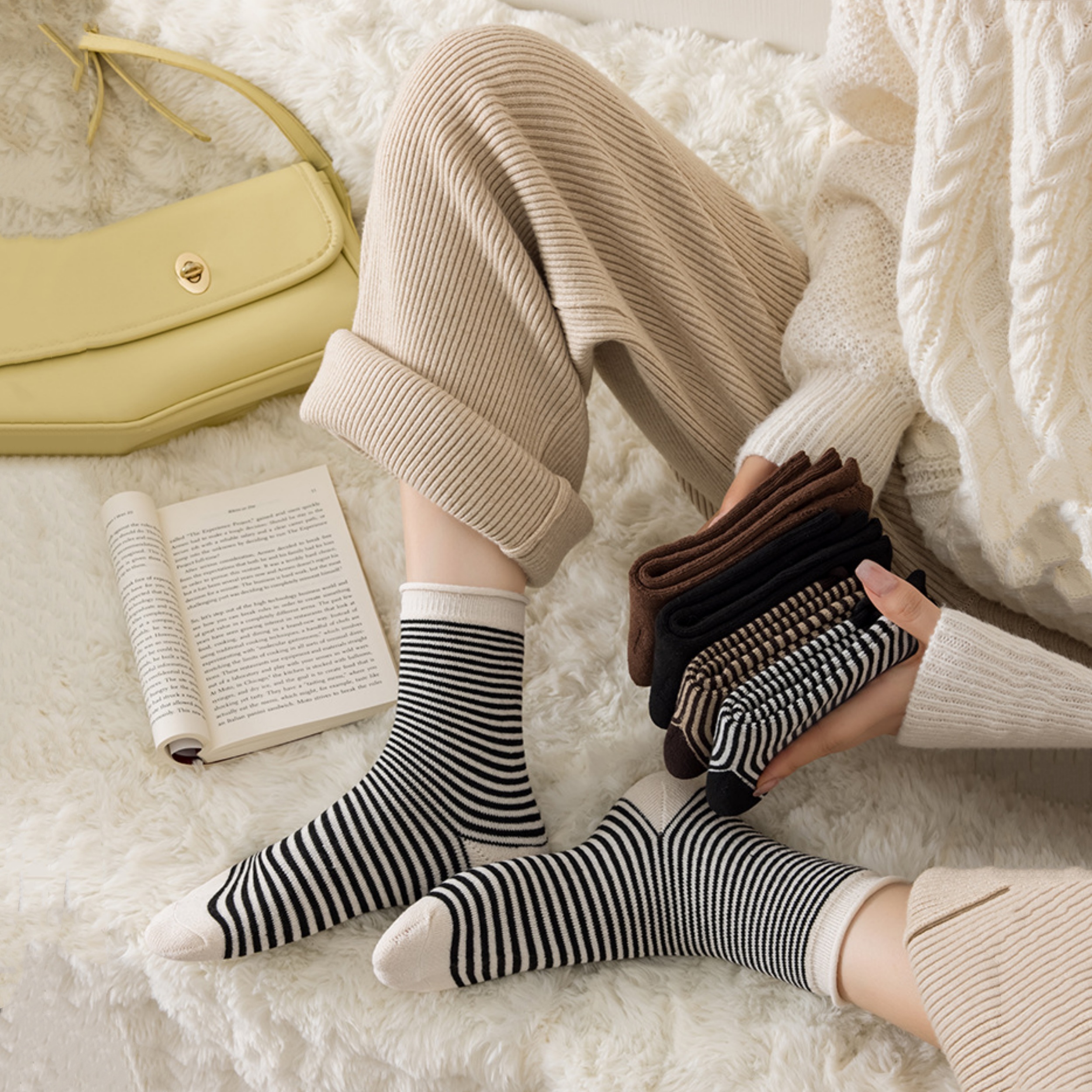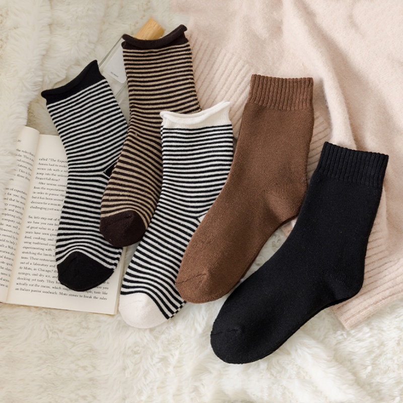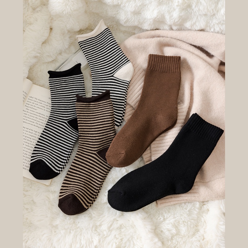 These brown striped terry socks feature a thick terry-knit design that provides excellent warmth, softness, and comfort. Perfect for autumn and winter daily wear.