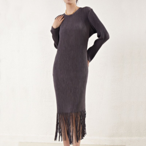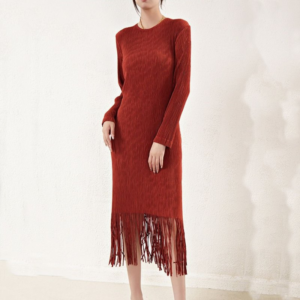 Factory Customized Women’s Spring and Autumn Style Hem Tassel Pleated Long Sleeve Round Neck Loose Dress