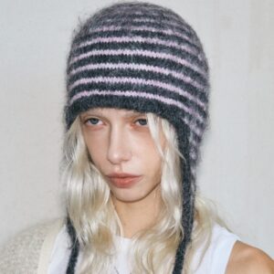 This striped knit tie-up earflap hat features a soft, warm knitted texture with secure tie straps for a snug fit. The earflap design blocks cold winds, while the thick construction enhances warmth for winter. Ideal for daily commuting, outdoor activities, and cold-weather wear.