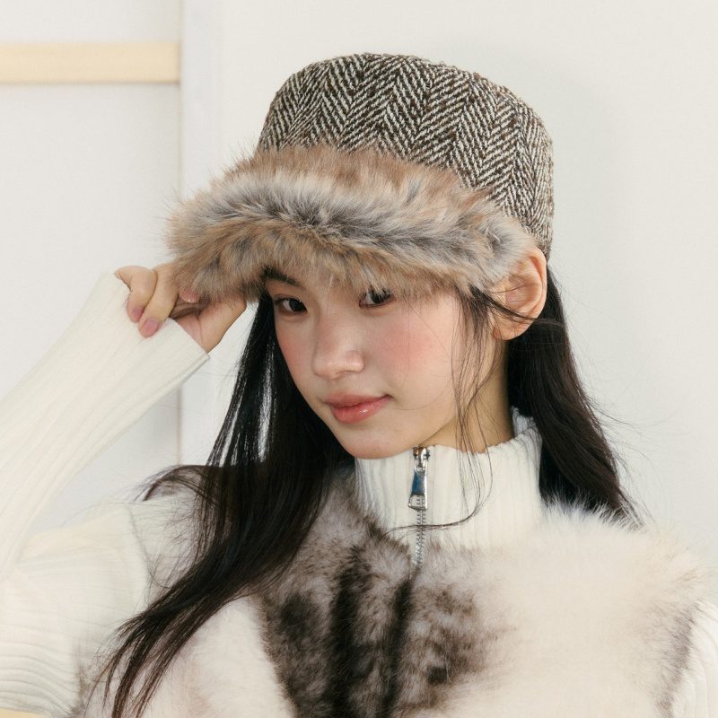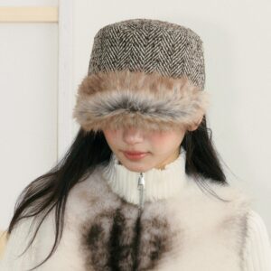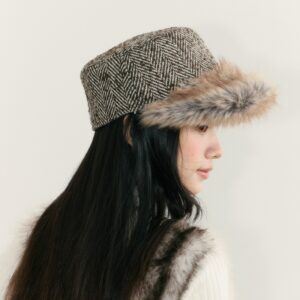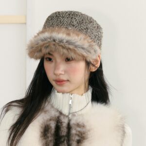 This vintage flat-top herringbone cap features a classic herringbone pattern combined with plush trim, offering both style and warmth. The flat-top silhouette creates a clean look, while the soft faux-fur details bring a cozy winter touch. With its structured shape and flattering fit, it’s perfect for autumn and winter commuting, street style, and everyday outfits. Pair it with coats, wool jackets, or knitwear for an effortlessly chic vibe.