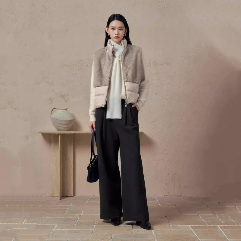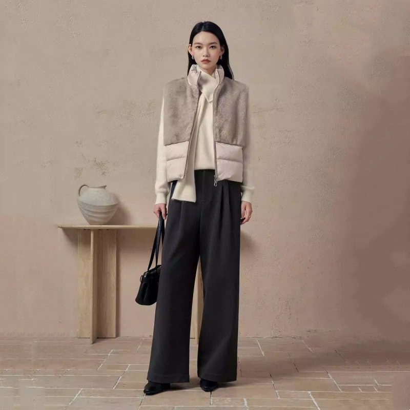 White Duck Down Eco Fur Patchwork Stand Collar Double-Zip Vest