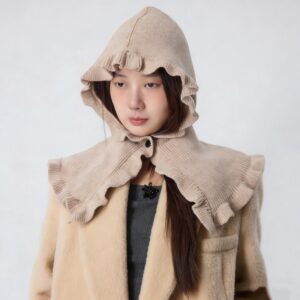 Made from a wool-blend yarn, this hooded scarf features a thick knit structure for enhanced warmth and cold protection. The ruffle-edge detailing adds a soft, feminine touch while elevating the overall design. The all-in-one pull-on style offers easy wear and a snug fit around the head and neck, perfect for everyday winter outfits, commuting, and outdoor use.