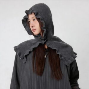 Made from a wool-blend yarn, this hooded scarf features a thick knit structure for enhanced warmth and cold protection. The ruffle-edge detailing adds a soft, feminine touch while elevating the overall design. The all-in-one pull-on style offers easy wear and a snug fit around the head and neck, perfect for everyday winter outfits, commuting, and outdoor use.